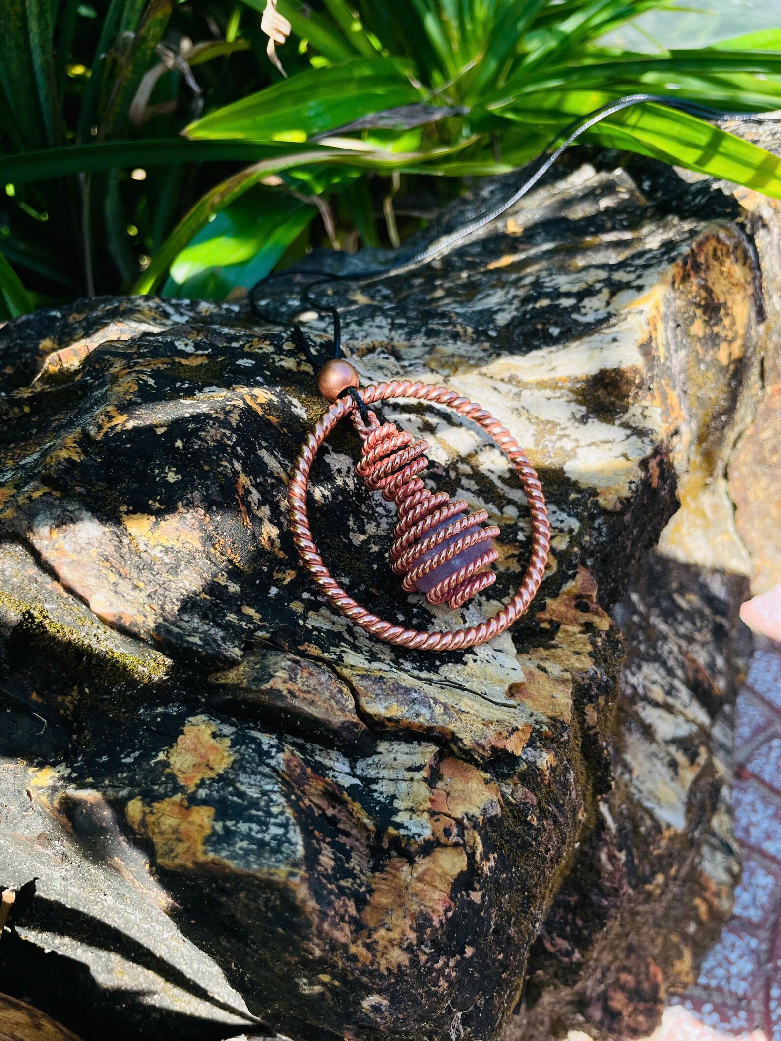 Trung tâm: Một tinh thể thạch anh tự nhiên được quấn xoắn tinh tế bằng đồng đỏ tinh khiết 99.99%, điều chỉnh theo tần số 443 MHz Viking Cubit, hỗ trợ chữa lành cảm xúc và bình an nội tâm.